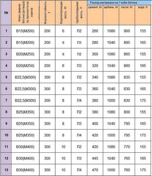 В рецептурах составления бетона даны по весу или объему. Причем цемент всегда приниматься за 1, а все остальные компоненты берутся по отношению к нему. Пропорции для часто используемых марок приведены в таблице.